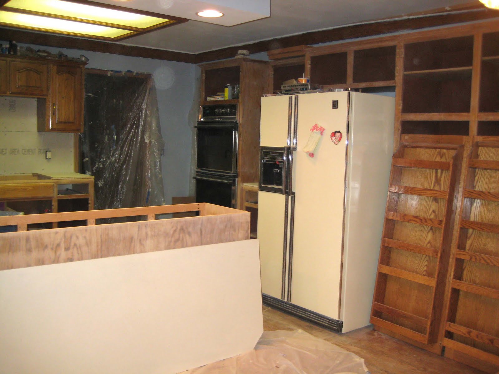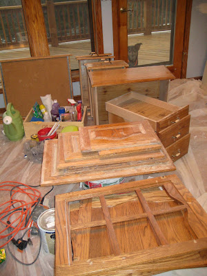 We chose to resurface the cupboards instead of refinish them. Resurfacing means to sand the existing finish and apply a new coat of stain. Refinishing means to sands down to the original wood with a heavy sand paper. The purpose of refinishing is to remove all deep nicks, scrapes, scratches, stains, etc. Our cupboards were in pretty good condition, so we chose to go the easy route of resurfacing. We will have to refinish the floor when we get to that part.