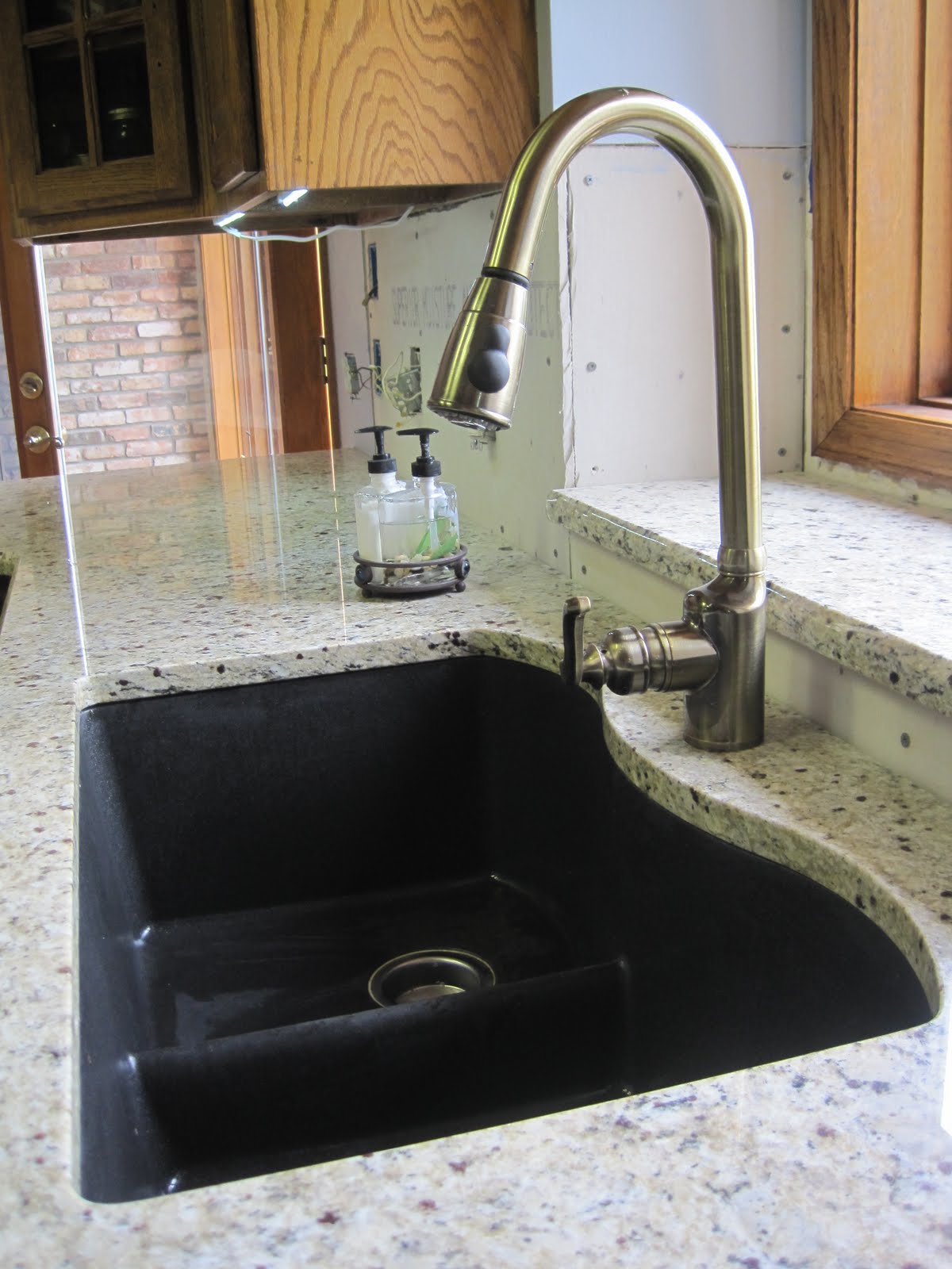 When you install new countertops, they usually recommend to install a new sink and we chose this beauty! A granite composite, undermount, double bowl sink in black! Complete with a lovely low-profile divider, which makes the sink better to accommodate larger pots. It has really made doing dishes easy, no more odd-shaped pans that won’t fit in the sink! I just love the wavy cut in the granite for the sink.