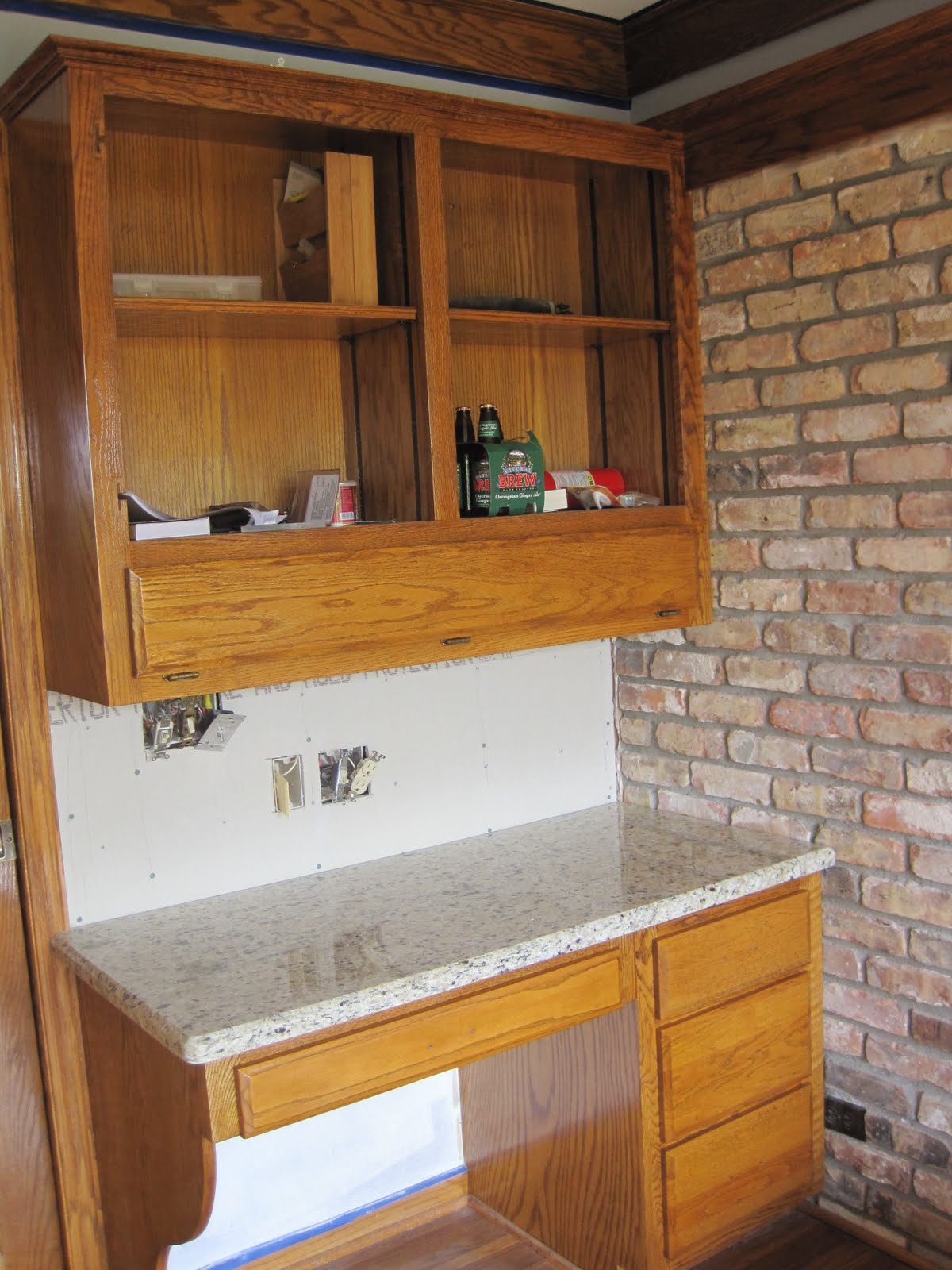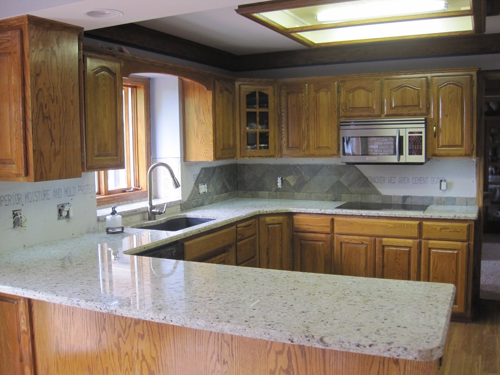 We originally chose a very beige looking stone color, New Venetian Gold, but two weeks after we ordered the granite, the company ran out of that particular color so we had to start over from scratch. I was so IN LOVE with that color! Oh well, things happen. We ended up with the New Venetian Light, which is more of whiter stone but we are pretty satisfied with the color. It doesn’t show ANY food crumbs or stains at all! I was wiping them off yesterday and it was so hard for me to tell if something was on the counter. It just blends in! Which I guess is a good thing in case we have some unexpected guests.