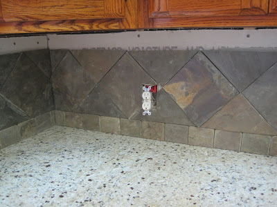 Up next on the “kitchen to-dos”, the backsplash! We chose this nice mixture of browns & grey slate tile for the backsplash. We felt the darker backsplash would add some depth to the kitchen and the blend on the slate is just so natural and very fitting for the granite countertops. My husband is very excited to get all of it installed, but due to his grueling work schedule lately he hasn’t been able to get as much finished as he likes. I am just excited that we are one step closer to finishing the VERY LONG remodel project!