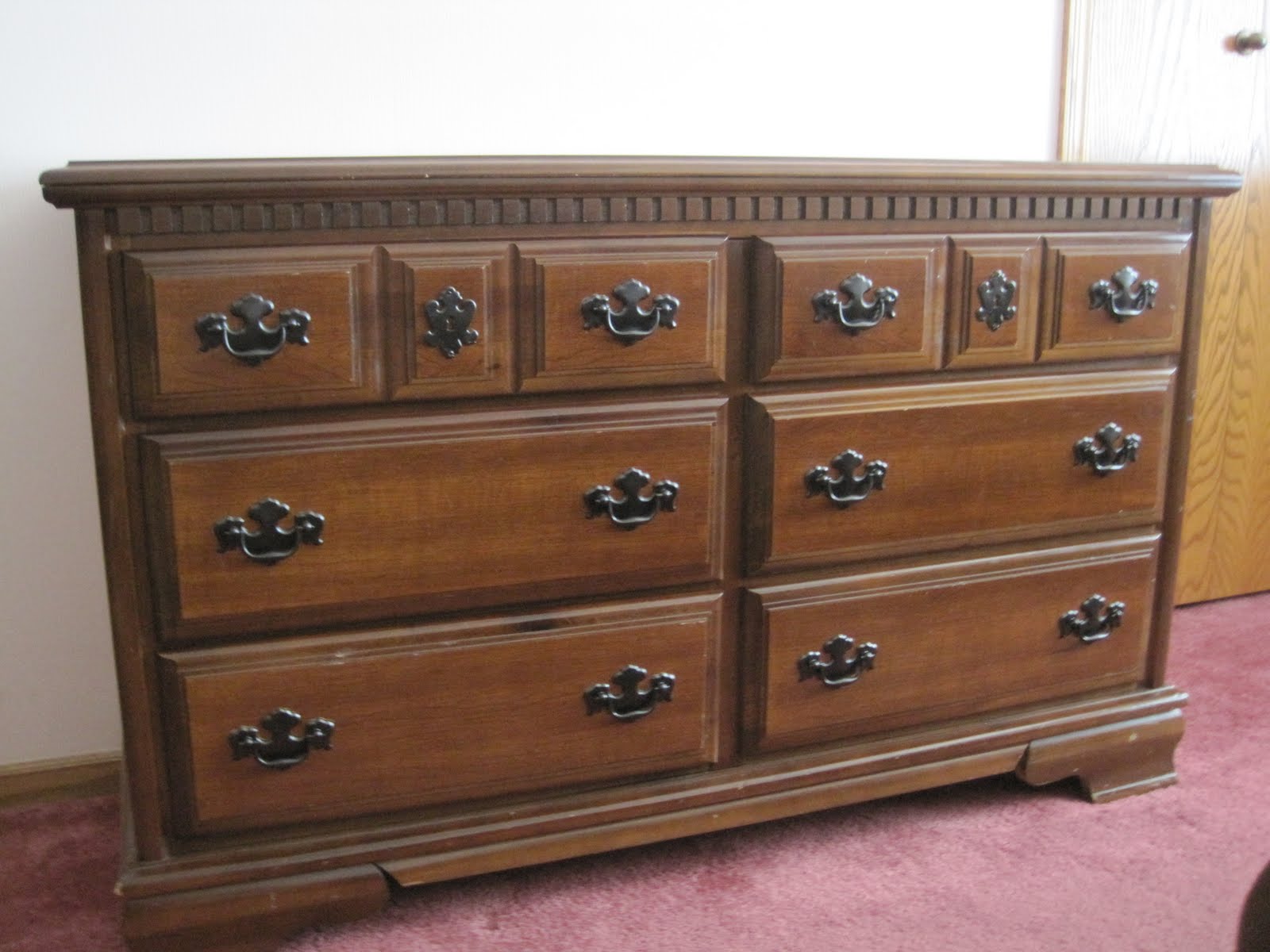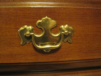 And here is the dresser/changing table after:I think the color of the new handles deepens the color of the wood on the dresser and I love it! Now if only I could rip up the maroon carpet in this room!