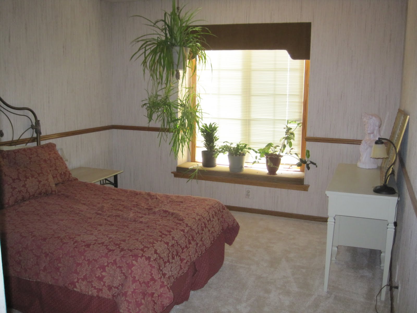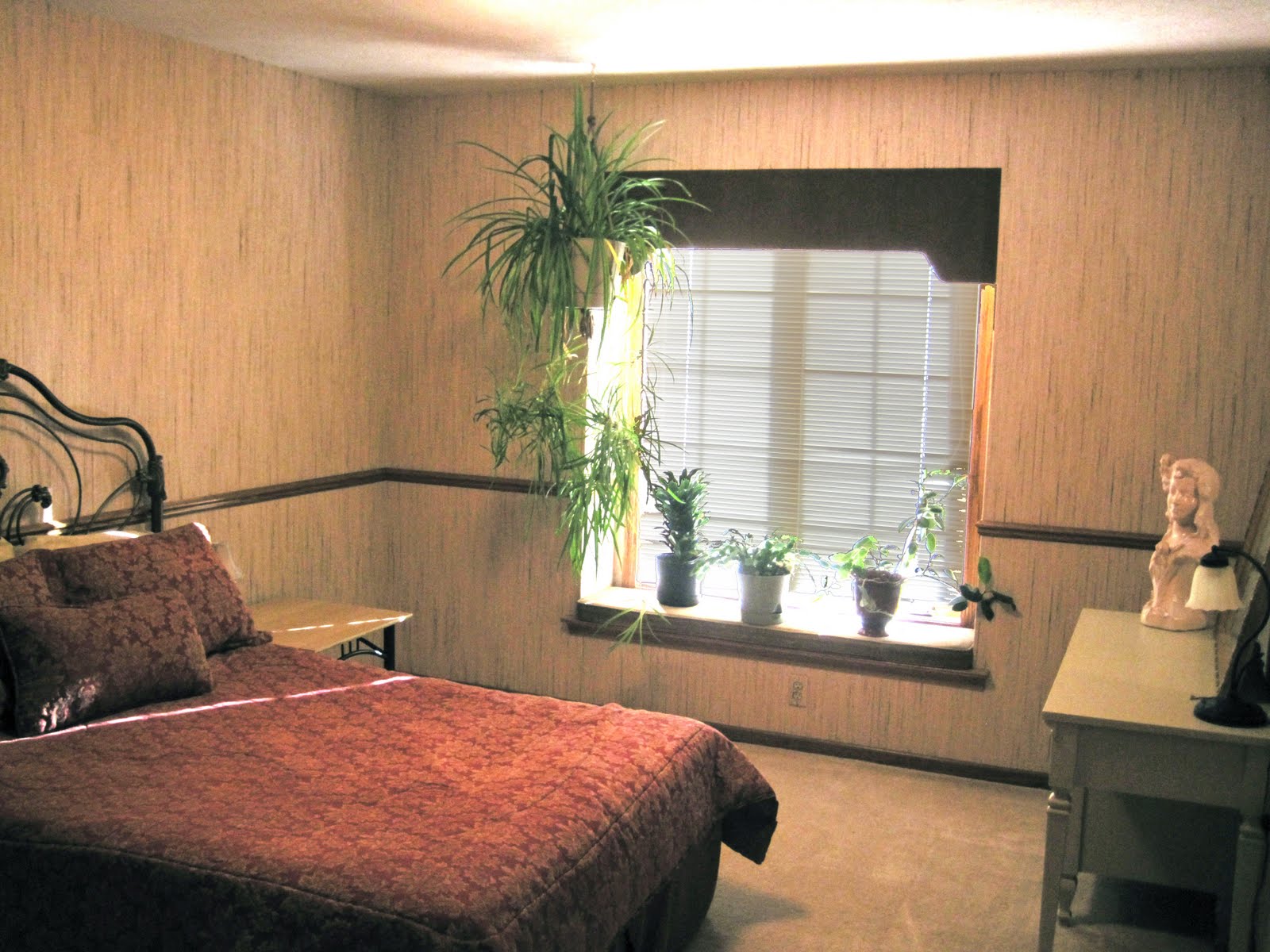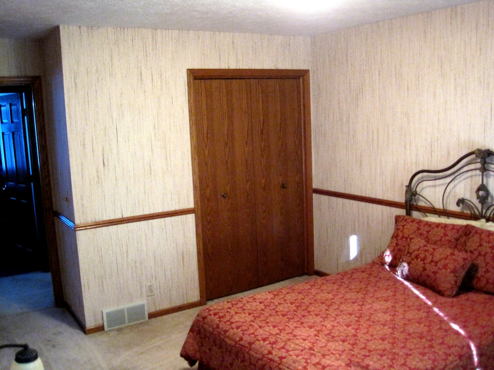 For the nursery, we have chosen the bedroom across the hallway from our master bedroom. The room is a good sized room (13’x11’3″) so I am hoping that we have plenty of room to create a really cute space for this little man. The room is pretty dated looking with it’s brown string wallpaper, but it has some other pretty good features: a nice quality chair rail, good sized closet with solid oak doors, and my FAVORITE PART a window seat! Below are a couple pictures of the room…really not the best pictures, but you get the idea of the VERY dated current look.