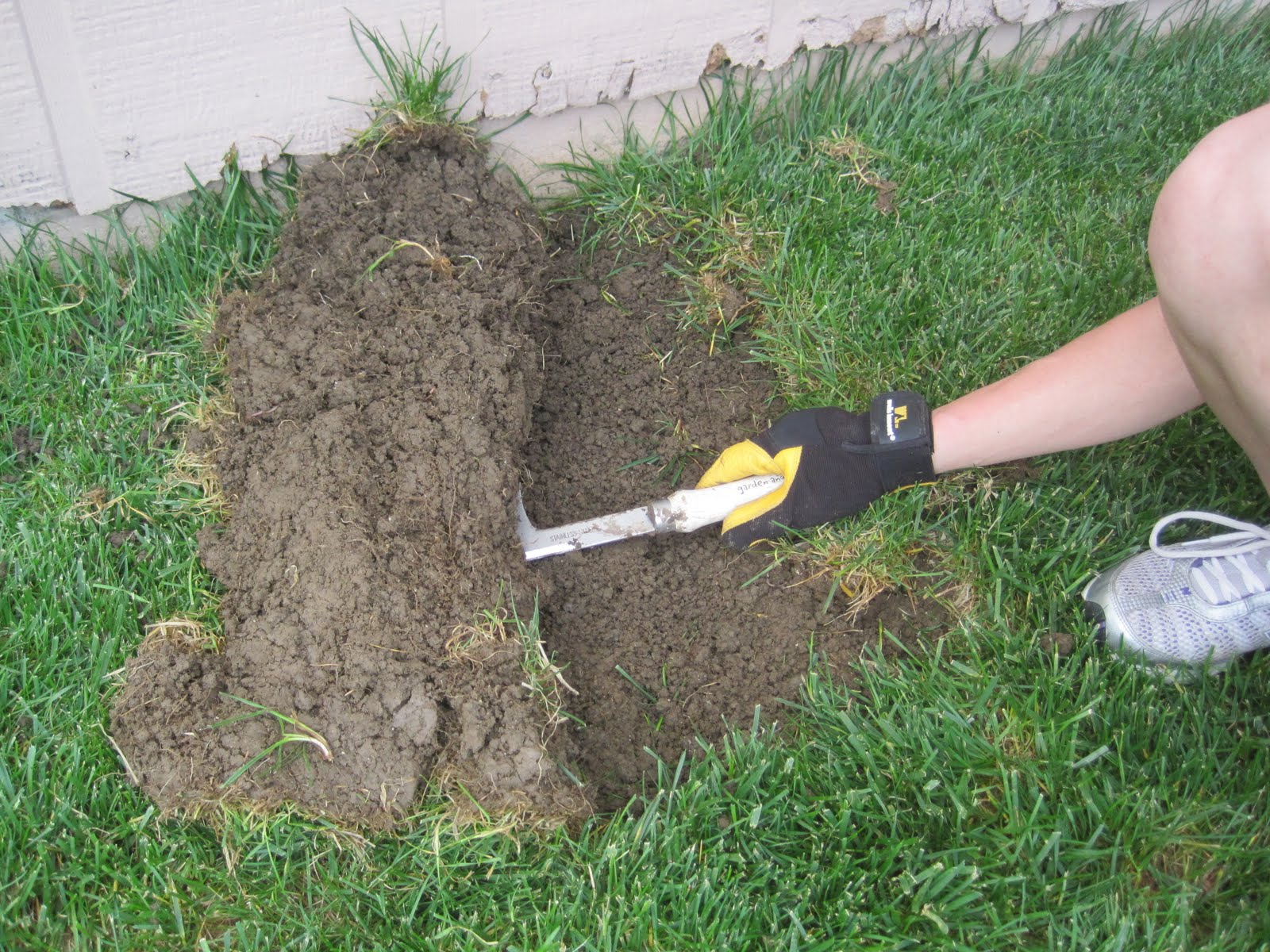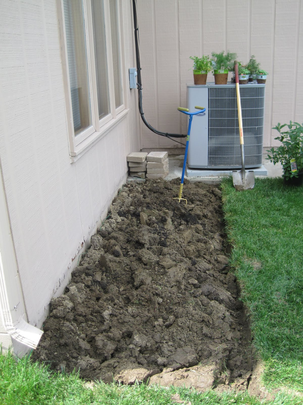 I removed all the grass from a 10′ x 42″ section. After all the grass was removed, I proceeded to dig a ditch. The ditch stops the grass from spreading into the bed. The ditch is about 4 inches deep and 2 inches wide. It is not necessary to add in a ditch if you are putting in an edging of some sort.