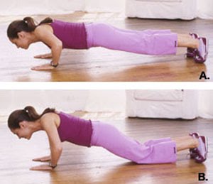 3. Keep abs tight and body in straight line from head to ankles. Try not to raise your hips up…keep it flat! The second pic (B.) shows the movement with knees resting on the floor (which is me after a couple!)