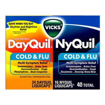 1. Gotta have DayQuil & NyQuilSure this stuff tastes like death warmed over but I find that if I take it as needed my fever seems to lessen and my head seems a bit clearer. Unfortunately after four hours I can feel it start to wear off. Either way I keep it on hand for the common cold makes its appearance.