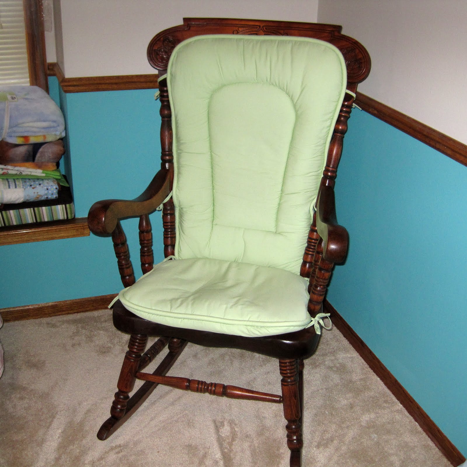 My Mom knew how much I was fretting about finishing this chair before the baby’s arrival, so she suggested I purchase this awesome product she had found. Varathane makes this stain and polyurethane in one. It was a lifesaver. I purchased the cherry color and it added just the right amount of red to the wood and applied the polyurethane at the same time. I used two cans, which at $10 a can it’s not cheap stuff, but it was worth the time it saved me. It took a few days to apply each coat, but it worked out great overall. As you can see the finished product turned out beautifully!