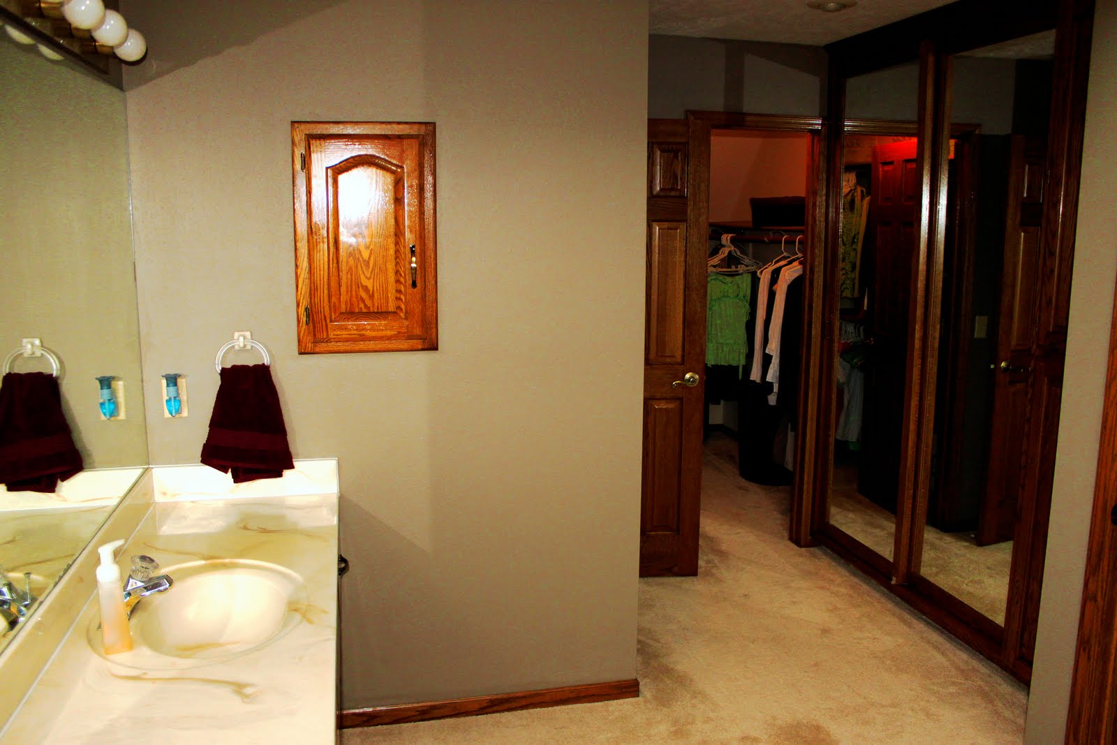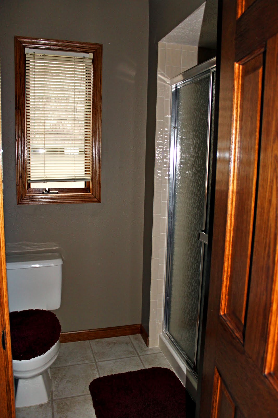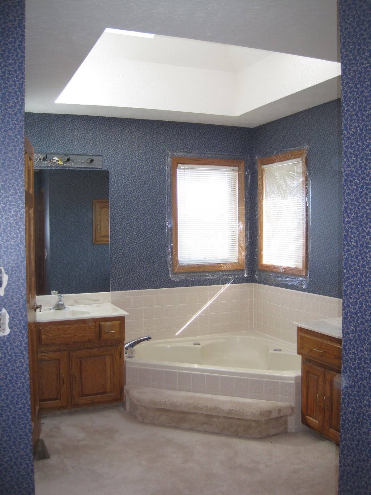 We have been very busy on the removing the wallpapaper from the last two bathrooms in our house. We have already redone three of our five bathrooms(see posts 1, 2, & 3) and we are so happy to now be finished with all five! I thought I would reveal the results in two posts. This post is master bathroom. We removed the wallpaper and resurfaced the wood. You will notice that we still have carpet in our master bedroom, which we would love to remove but we decided not to do that at this point and time.