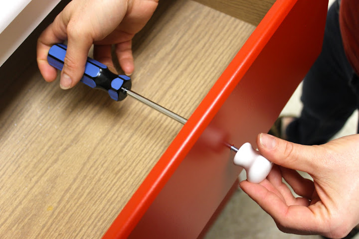 While at Lowes I also picked up some white porcelain knobs for the dresser and replace the existing ones.