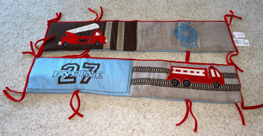 I have been working on a fire truck room for Aiden for the last few months. (See post The Fire Truck Room #1.) I have been taking it slow…mainly because this pregnancy of mine won’t let me do anything fast, but also to gather ideas. I looked and looked for a toddler bed set for my son’s room. It turns out they don’t have really any cute toddler bed bedding sets for fire trucks. There are a few out there, but I wasn’t a real big fan of any of these. I like the red, white, and brown coloring of this crib set so I decided to purchase it. The quilt and the bottom sheet fit the toddler bed and I really like the window valance….but what to do with the crib bumper and diaper holder….