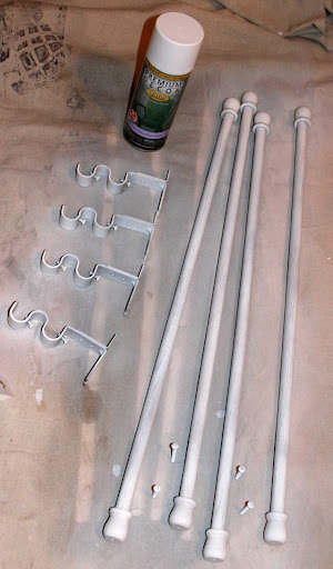 Now if you don’t like the color of your brackets and dowels, you will need to spray paint them. I wanted mine white to match my shelves above. Spray the brackets, dowels, end caps, and screws for the brackets.