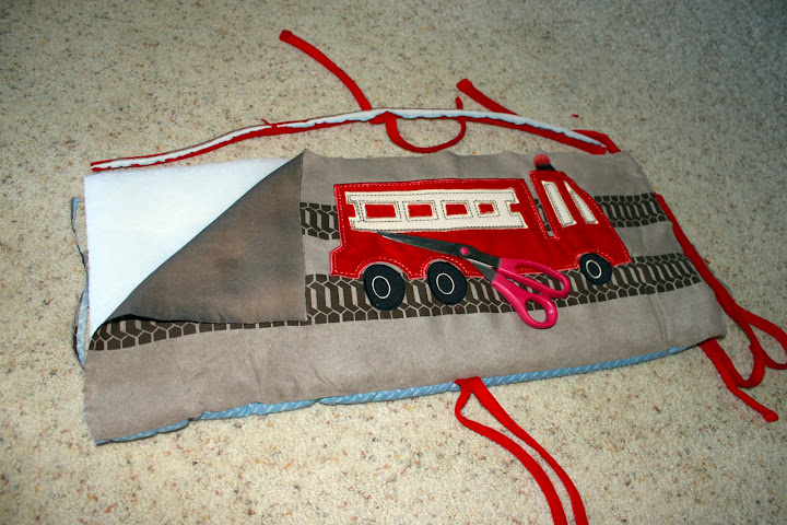 I just wanted the fire truck parts, so I cut them apart and also cut the sides off the top and the edges. Leave the bottom in tact, as this is your pocket for books. Also, you will need to remove the batting on the inside. I had to remove mine at the bottom with a seam ripper.