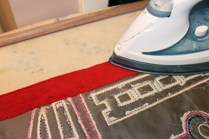 Once you have the batting removed, decide your desired width. I only wanted mine to be about 22″ wide, so I trimmed my material down. Take an iron and iron down the edges of the book pocket to be about a 1/4″ hem. This just helps with the sewing.