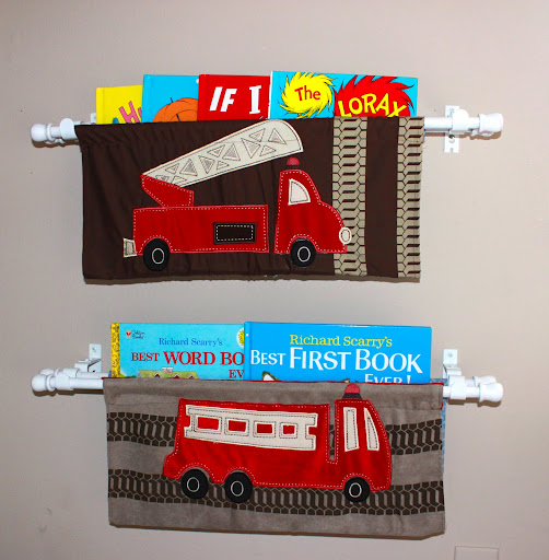 Ever wonder what to do with those crib bumpers? Now you could be like me, and use them in the crib (even though they say not to) until you feel your child is big enough not to get stuck in the crib rails. (My guy was little when he was born, so it took him a few months to catch up in size.) The other option for a crib bumper is to turn them into some cute hanging bookshelves for your wall!