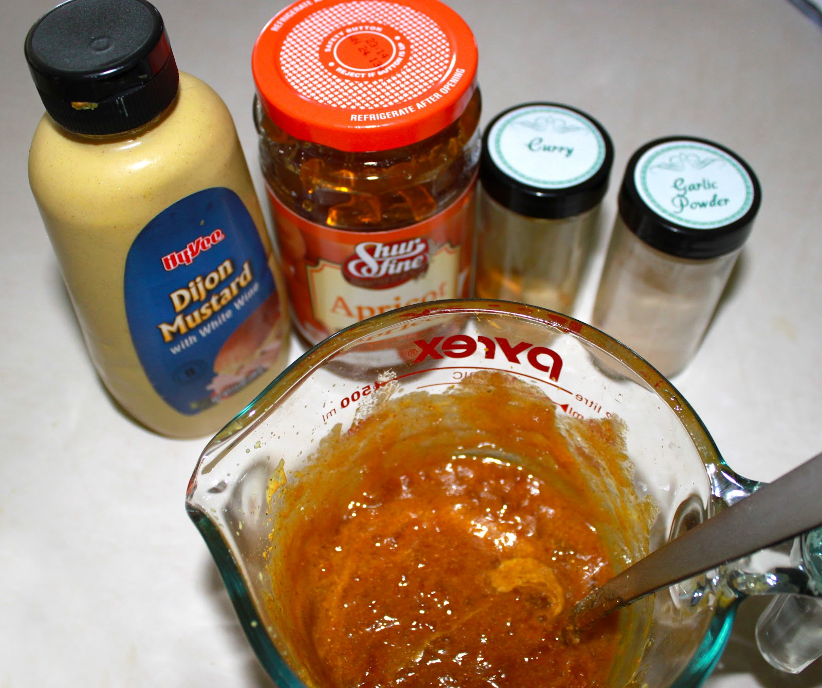 1. Mix the apricot preserves, mustard, curry powder, and garlic powder all in one container.