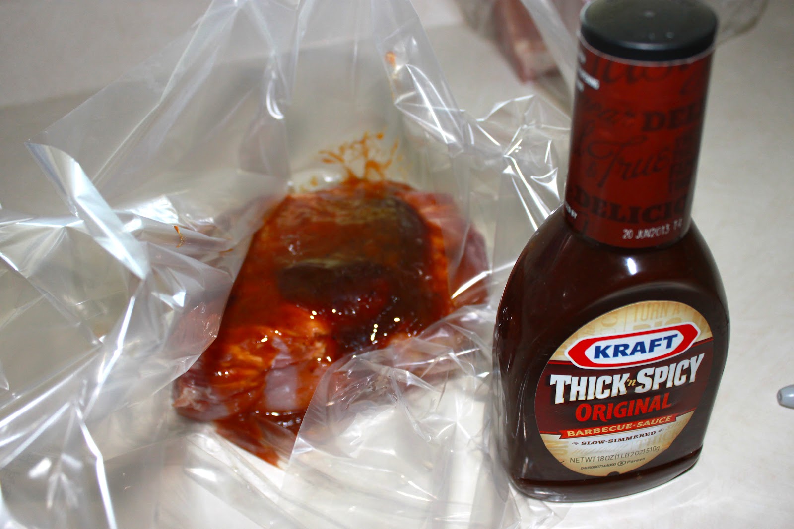 2.. Cover the pork loin with BBQ sauce and Twisty-tie the crockpot liner bag.