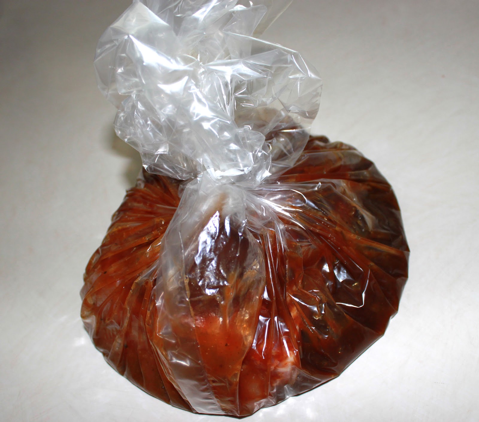 4. Divide sauce evenly over the the top of both pieces of pork loin. Twisty-tie the crockpot liner bag.