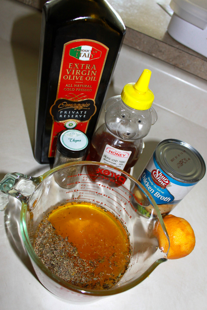 1. Mix honey, orange juice and zest, olive oil, thyme and chicken broth together.