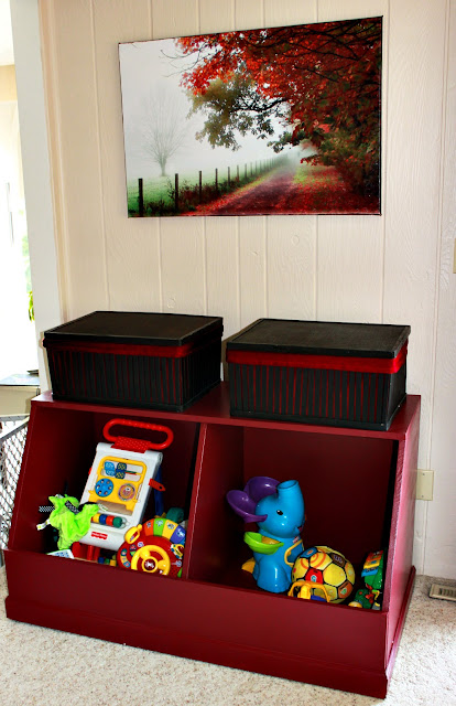 Also, as an added bonus I found out that I had some baskets that fit the top of it perfectly, so even more toy storage!! (Just so you know, half of the bins are empty and the baskets are empty, just room for more toys someday!)