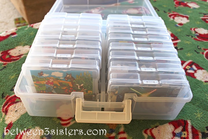 I had an idea that this might be just what I need to organize these puzzles. This box opens up and contains little boxes (originally designed to hold 4″x6″ photos) but all I could think of is PUZZLE PIECES!