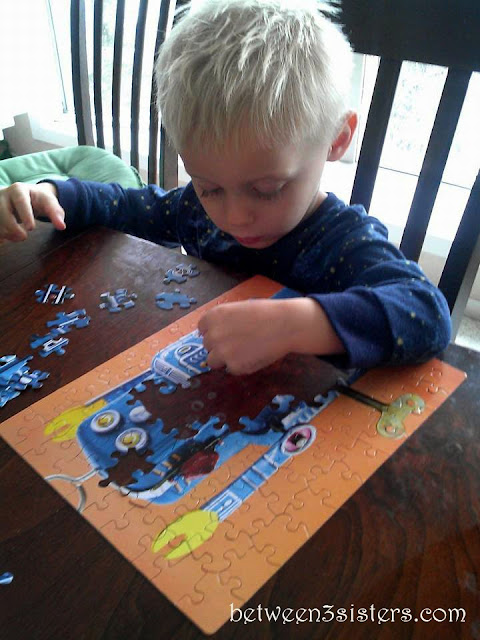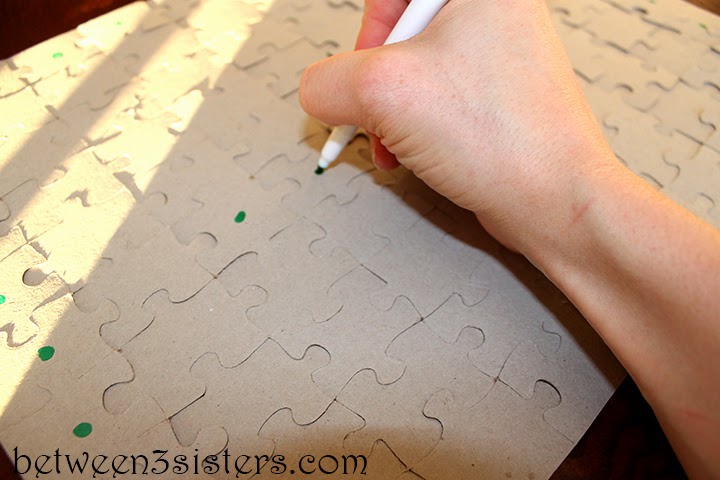 Let the puzzle organization begin! I first decided to make sure all of our puzzles had all their pieces. We put them together and I marked the back of each puzzle with a different symbol. If they ever get mixed up, it will make it easier to tell them apart.